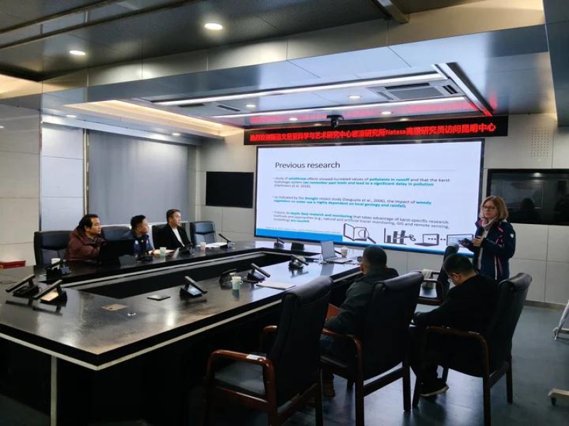访问期间,娜塔莎教授以《森林干扰对岩溶补给的影响》为题作专题学术报告。报告结合斯洛文尼亚经典喀斯特区的长期监测数据,深入浅出地解析了暴雪、飓风、干旱、病虫害等自然干扰因素对岩溶地区脆弱水文过程的复杂影响机制,揭示了林地覆盖变化与地下水水质、水量动态变化的耦合关系,并展示了基于数值模拟技术的岩溶含水层补给量预测模型等最新研究成果。同时,报告系统介绍了欧洲岩溶监测的前沿技术与生态保护经验,为与会中方科研人员提供了宝贵的参考。在互动交流环节,双方围绕岩溶水资源高效利用、石漠化综合治理等议题展开热烈讨论,共同探索岩溶科学研究的核心问题与创新路径,实现了思想碰撞与智慧交融。